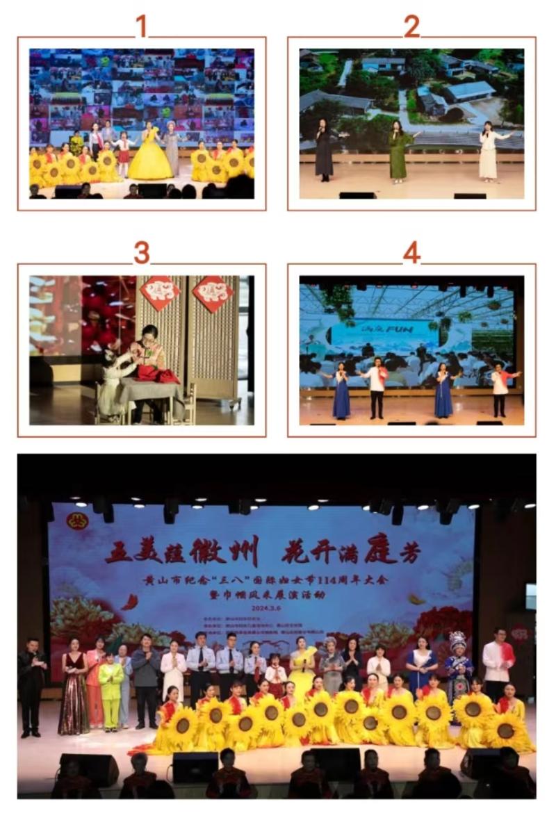 会上表彰了全国三八红旗集体,安徽省三八红旗手、安徽省三八红旗集体,黄山市三八红旗手标兵、黄山市三八红旗手、黄山市三八红旗集体,受表彰代表上台领奖。当天的展演围绕“田野上的徽乡女儿”“云端上的徽州美宿”“科技上的巾帼力量”“舌尖上的妈妈味道”“指尖上的徽女巧匠”五个篇章展开,以情景舞蹈、情景剧、小品等形式讲述“她”故事、展现“她”风采、致敬“她”力量。
