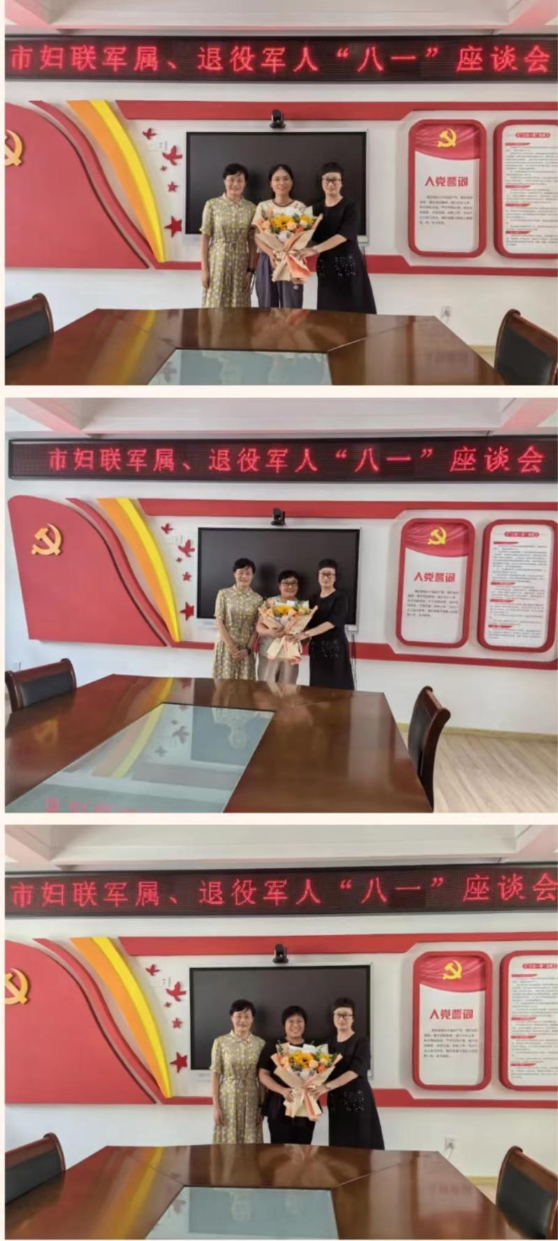 为深入贯彻习近平强军思想,弘扬拥军优属的优良传统,8月1日,市妇联举行军属、退役军人“八一”座谈会,集中慰问三位军人家属、退役军人,向她们致以诚挚的节日问候。