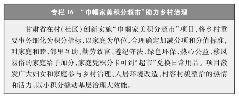 积极发挥家庭家教家风建设在基层治理中的作用。健全家庭文明建设、家校社协同育人、家庭服务有效供给、婚姻家庭矛盾纠纷化解等机制,为妇女引领家庭成员共建共享平安和谐社会提供保障。深化家庭文明建设,开展寻找“最美家庭”活动,持续创建文明家庭、评选五好家庭,开展“家规家训亮家风”“家书家信传家风”“科学家教育家风”等培育好家风系列活动,大力弘扬爱国爱家、相亲相爱、向上向善、共建共享的社会主义家庭文明新风尚。累计创建全国文明家庭1597户,评选全国五好家庭6258户,涌现出各类“最美家庭”1648万户,组织家教家风巡讲展演活动50多万场,覆盖2.5亿人次。