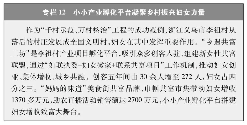在乡村振兴中勇立潮头。实施乡村振兴巾帼行动,加强女农民培训赋能,2017年以来,“高素质农民培育计划”培训女农民224.1万人次;2022-2024年,乡村产业振兴带头人培育“头雁”项目培训妇女1.2万人。广大妇女在乡村振兴中大显身手,乡村工匠“双百双千”培育工程认定的第一批乡村工匠名师中妇女共有100人,占36.6%;第一届全国农民技能大赛总决赛中,获奖选手妇女占69.5%;截至2024年底,获得技术职称的女农技推广员为13.4万人,占35.4%。