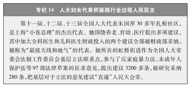 通过人民代表大会行使国家权力。人大代表中妇女代表比例不断提升。2023年第十四届全国人大妇女代表790人,占26.5%,比第十二届、十三届分别提高3.1个、1.6个百分点;全国县、乡两级人大妇女代表比例分别为31.64%、32.36%。人大妇女代表依法履职尽责,听取和反映妇女群众和各方意见建议。2018-2025年,全国人大妇女代表提出建议、批评和意见共29328件,占建议总数的42.3%。