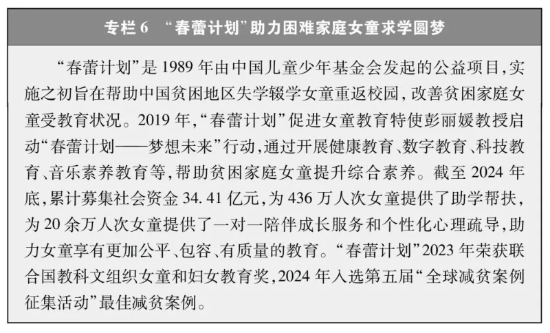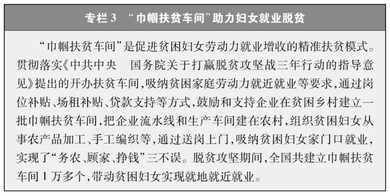发展生产助力妇女就业增收。坚持开发式扶贫方针,赋能贫困妇女发展。加强产业扶持,推进食品加工、服装制造等劳动密集型产业梯度转移,产业帮扶政策覆盖98.9%的贫困户,通过东西部劳务协作、建立扶贫车间、开发乡村公益性岗位等,为有劳动能力和意愿的贫困妇女提供工作机会;鼓励支持电商扶贫、光伏扶贫、旅游扶贫等新业态新产业发展,帮助贫困妇女实现家门口就业;发展民族地区手工编织产业,让“苗绣”“彝绣”等订单式手工编织从“指尖技艺”转化为“指尖经济”。加强财政和金融支持,脱贫攻坚期间,出台专门政策提供免抵押免担保的贴息贷款、税费减免等支持,累计为妇女发放小额担保贷款和扶贫小额信贷4500多亿元,870万名妇女实现创业增收;2021-2024年,192.8万名妇女持续获得脱贫人口小额信贷768.3亿元。加强能力培训,开展多渠道、多层次、多形式的职业技能培训、创业培训和农业实用技术培训,截至2020年,累计对1021万名贫困妇女和妇女骨干进行各类技能培训;2023-2024年,“雨露计划”共资助63.2万名妇女接受职业教育,妇女发展内生动力持续激发。