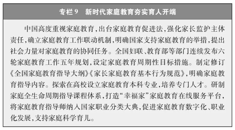 国家发展规划明确妇女发展战略任务。五年规划是规划期内中国经济社会发展的蓝图和行动纲领。中国在科学编制五年规划、部署落实现代化建设的战略目标时,将妇女发展目标纳入其中。第十二个五年规划(2011-2015年)首次对促进妇女全面发展进行专节部署,就开发妇女人力资源、加强妇女劳动保护、严厉打击暴力侵害妇女违法犯罪等提出明确要求。第十三个五年规划(2016-2020年)进一步强化妇女权益保障,首次设立专章部署保障妇女平等获得就学、就业、参与社会事务的权利和机会,消除对妇女歧视和偏见等任务,提出妇女扶贫减贫目标。第十四个五年规划(2021-2025年)接续规划妇女健康、教育、劳动、参政、社会保障等各方面权益目标,首次增设“加强家庭建设”专节,着力优化支持家庭发展的政策和服务。