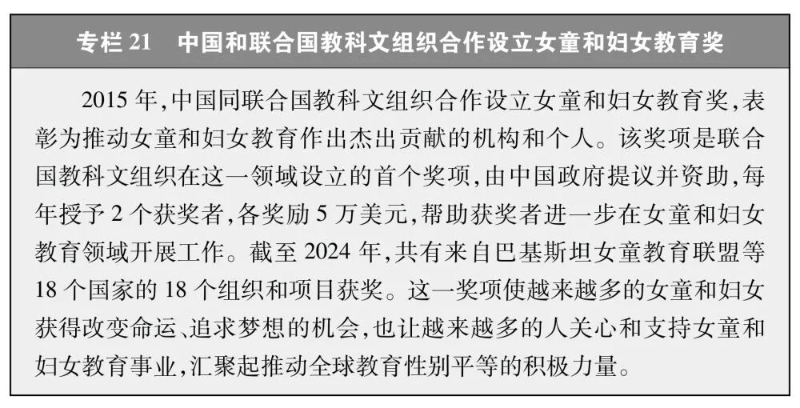 支持联合国发挥核心作用。与联合国妇女署共同举办全球妇女峰会,推动各国履行承诺,为全球妇女事业发展注入新动能。在联合国人权理事会,中国围绕促进和保护妇女权益多次作共同发言,推动通过相关决议,呼吁各国携手落实《北京宣言》和《行动纲领》。持续组派高级别代表团出席联合国妇女地位委员会会议,与联合国组织和相关机构合作,围绕妇女减贫、数字经济、普惠金融、技术赋能、人口变化中的性别平等开展研讨,分享促进妇女发展的中国经验。2015年以来,中国向联合国妇女署捐款2000万美元,与联合国多个专门机构开展妇女领域务实合作,同联合国教科文组织合作设立女童和妇女教育奖,在非洲开展女童数字教育、健康教育等项目。中国妇女在联合国系统担任要职、专家,为促进妇女领域全球治理贡献智慧。
