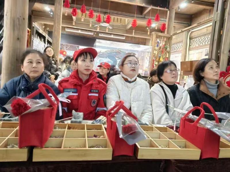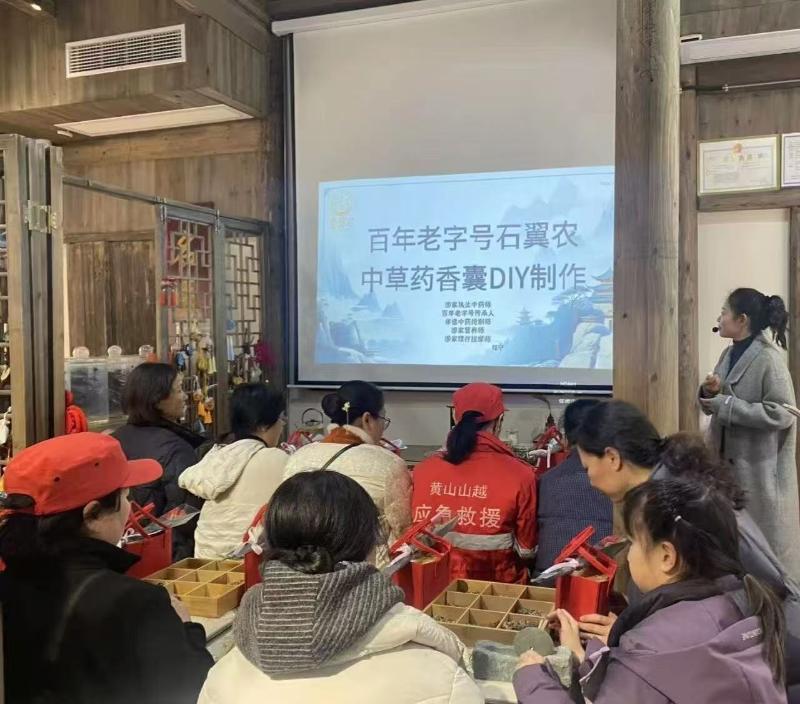 在非遗香囊制作环节,大家细心选材、配比药材、封装系结,将艾草、藿香、陈皮等养生药材装入精致绣囊,在动手实践中感受传统技艺之美,收获专属非遗礼物。
